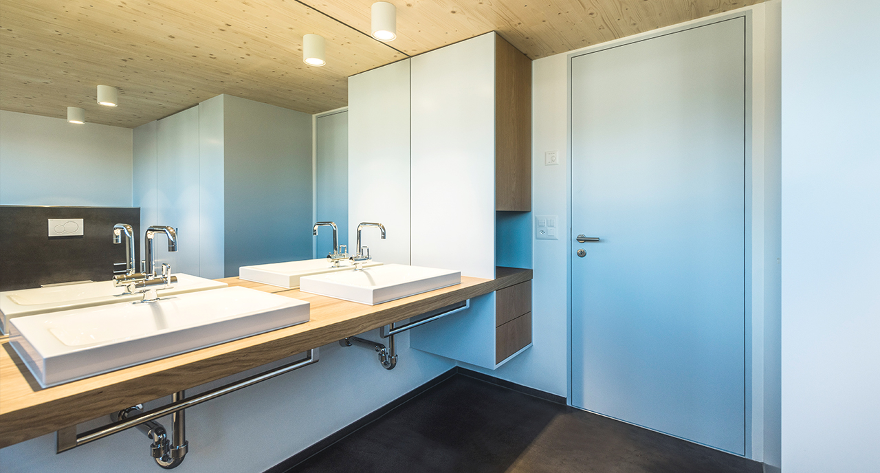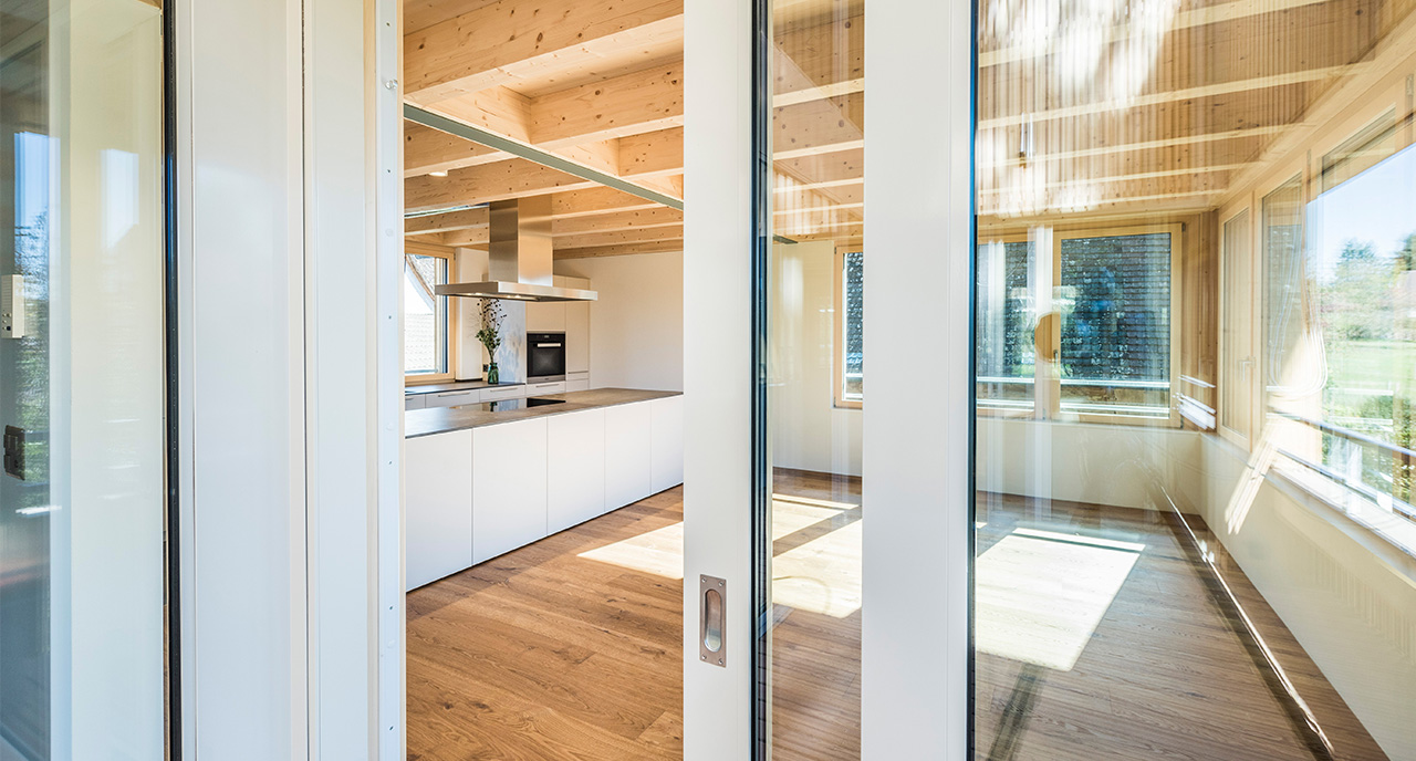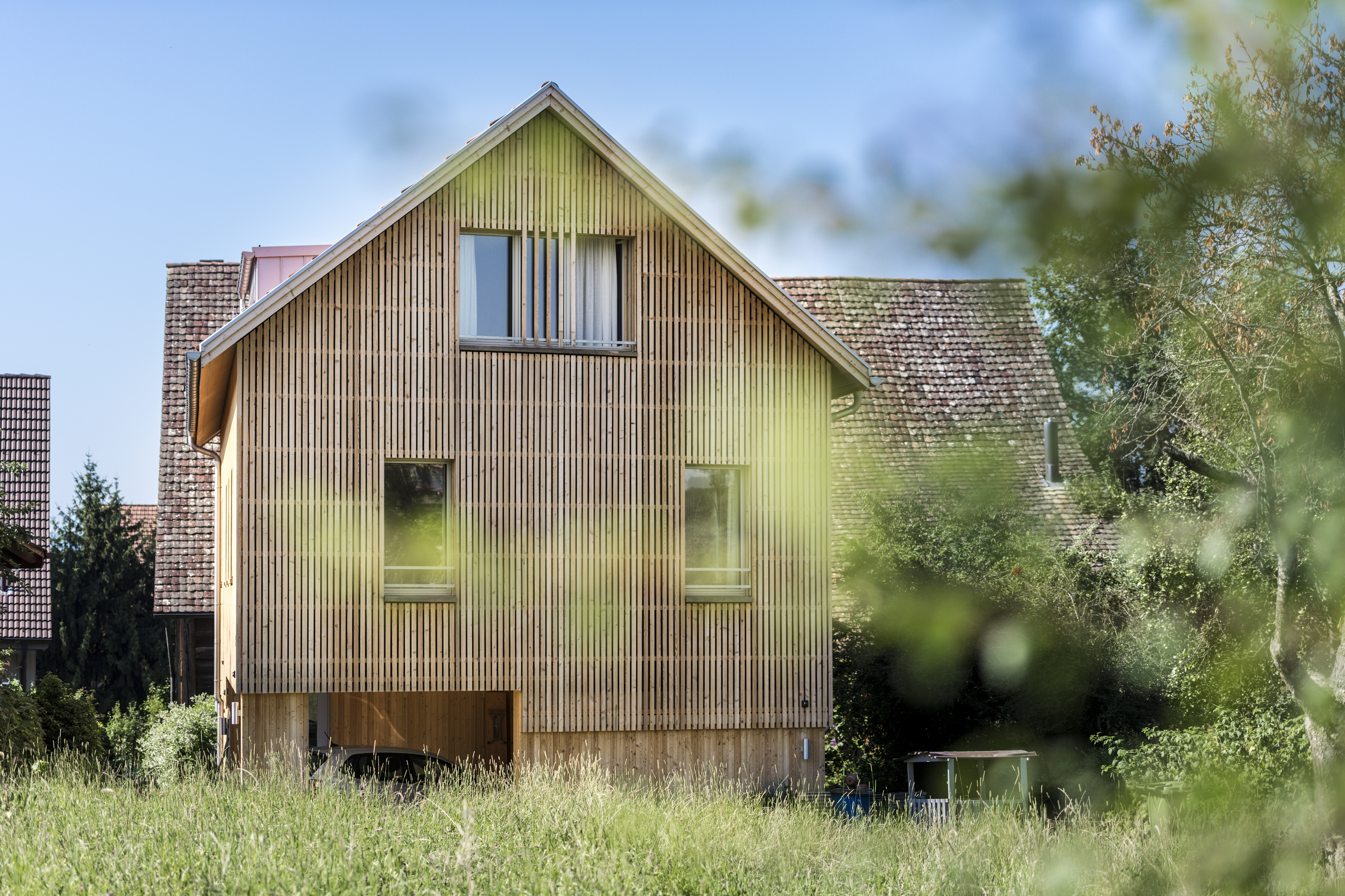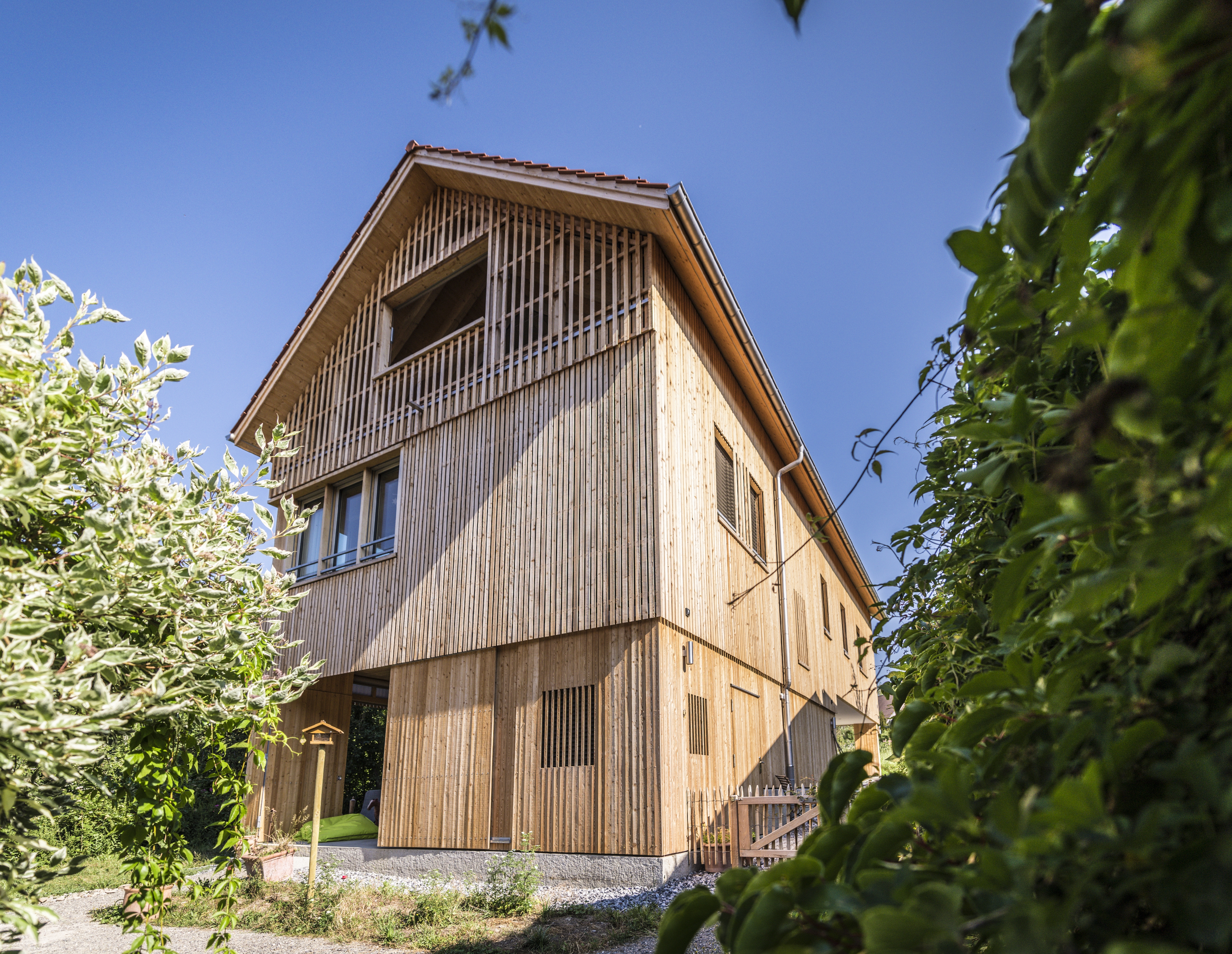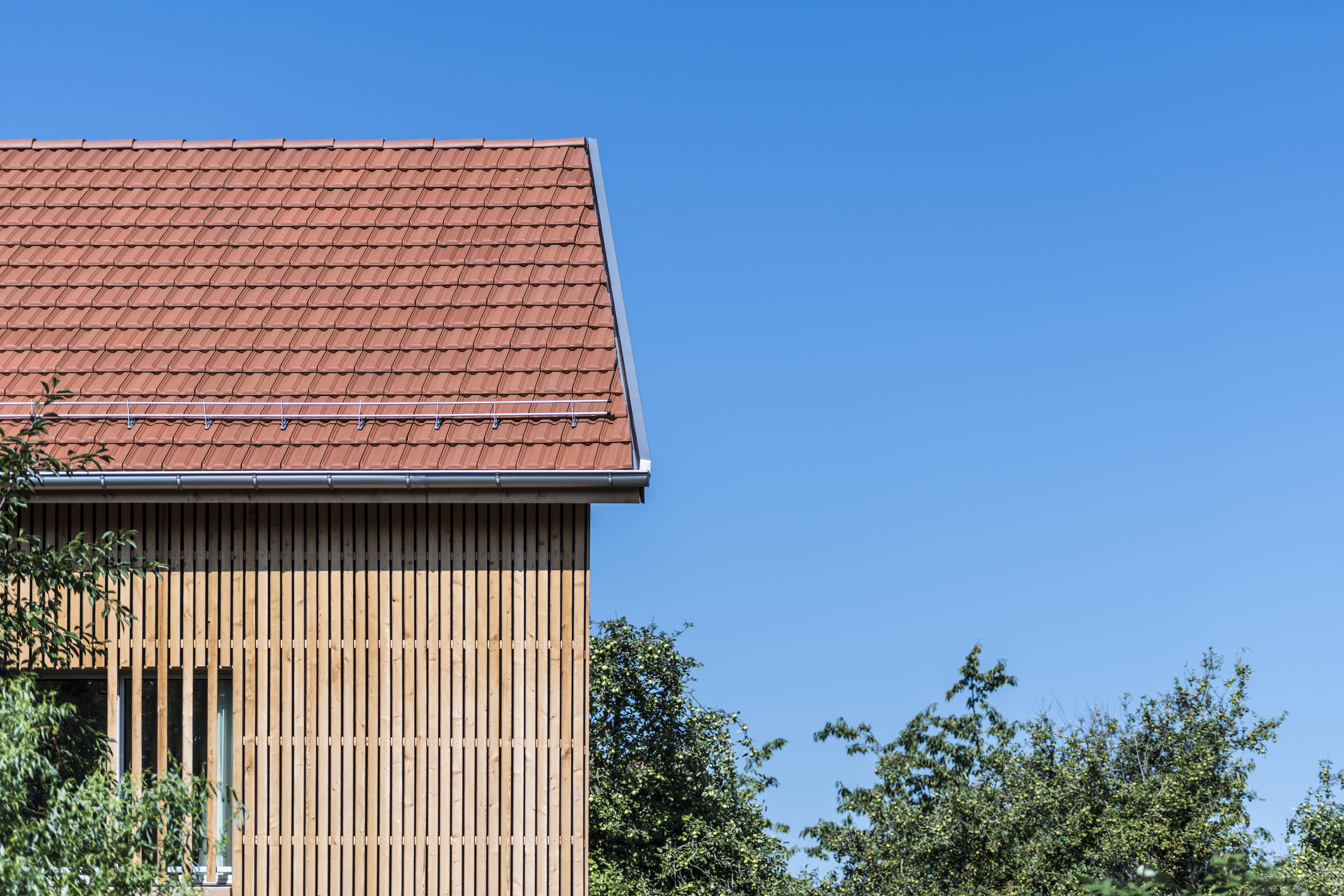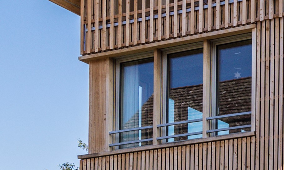 Ausgehend von den halböffentlichen Nutzungen im Erdgeschoss, wird der Grad der Privatsphäre zum Dachgeschoss hin kontinuierlich gesteigert. Die Öffnungen der Obergeschosse treten als schlicht gesetzte Brüstungsfenster in Erscheinung. Schlüsselelement ist das repräsentative Fensterband mit Eicheneinfassung, welches über Eck läuft und die typische Fensterreihungen von Holzbauten interpretiert. Die zweigeschossige Laube erlaubt demgegenüber spannungsvolle Sichtbezüge zwischen den Räumen sowie Geschossen und lässt den Blick, wie in einem Heuboden, bis unter die Ziegel gleiten.