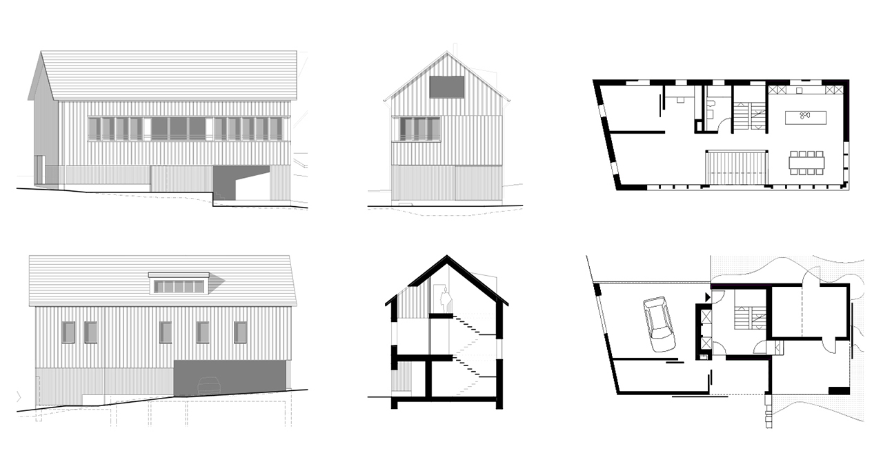 Auf dem gestockten Betonsockel, welcher der Topografie folgt, steht die geschossweise gegliederte Holzfassade aus sägeroher naturbelassener Lärche mit nutzungsgebundenen Öffnungen. Der Alterungsprozess führt dazu, dass sich der Ersatzbau auf natürliche Weise und würdevoll in dem Bestand eingliedert. Im Erdgeschoss ist die Fassade mehrheitlich geschlossen. Zwei große Holzschiebetore verweisen auf die Tenne und erzeugen, je nach ausgeübter Tätigkeit der Bewohner und Besucher einen offenen oder geschlossenen Charakter. Die übrigen Geschosse spielen mit unterschiedlich geöffneten Schalungen und erzeugen einen subtilen Filter, welcher sich gegen oben öffnet.