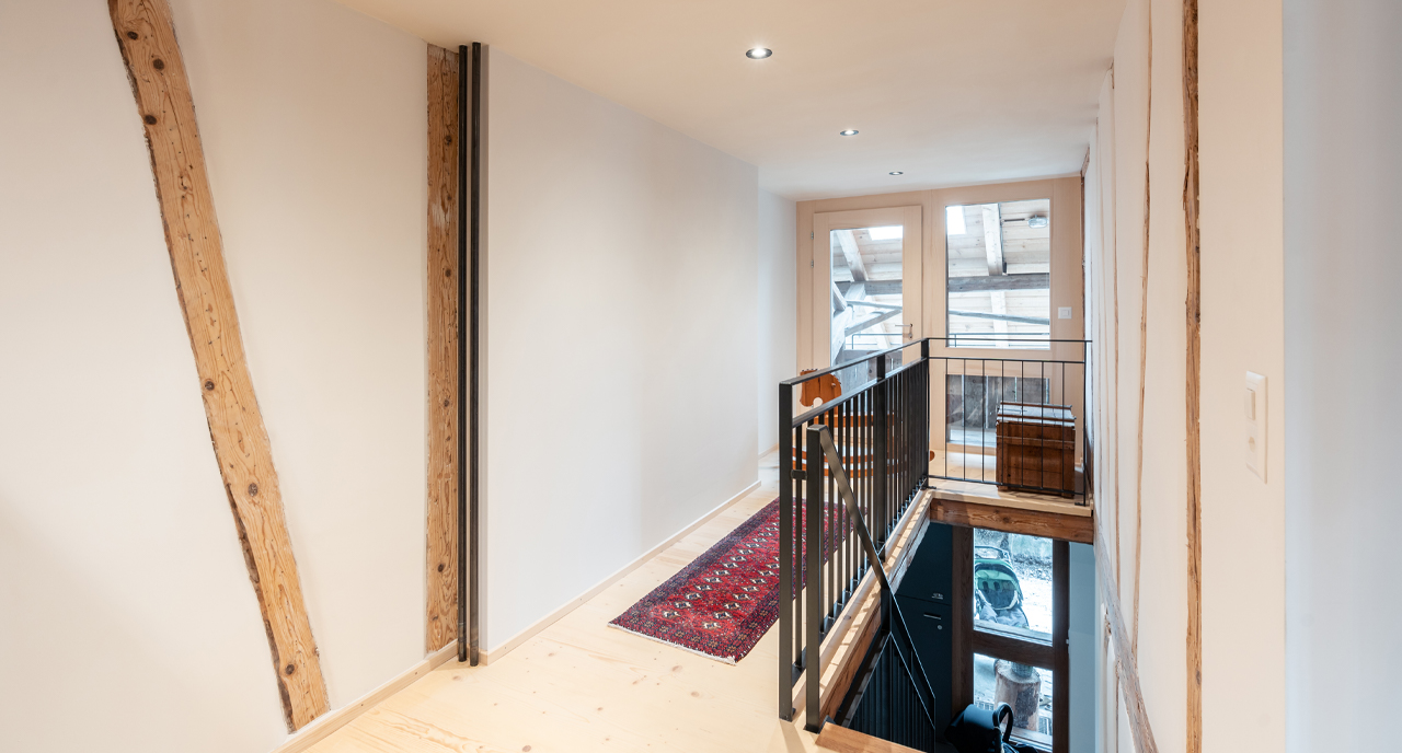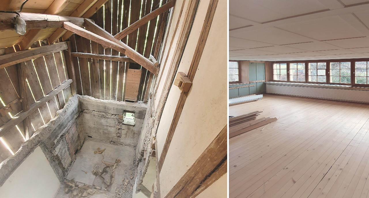 Reichle Architekten hat als Bauleitung und Unterstützung von zeichnerischen Belangen zur subtilen Sanierung des ursprünglichen Wohnteiles beigetragen. Mit angemessener Würde erfolgte eine Abwägung der Bedürfnisse der neuen Besitzerfamilie und der historischen Bausubstanz und es wurden Strategien entwickelt, bei welcher die bestehenden Qualitäten hervorgehoben und «Bausünden» aus vorigen Epochen eliminiert wurden.