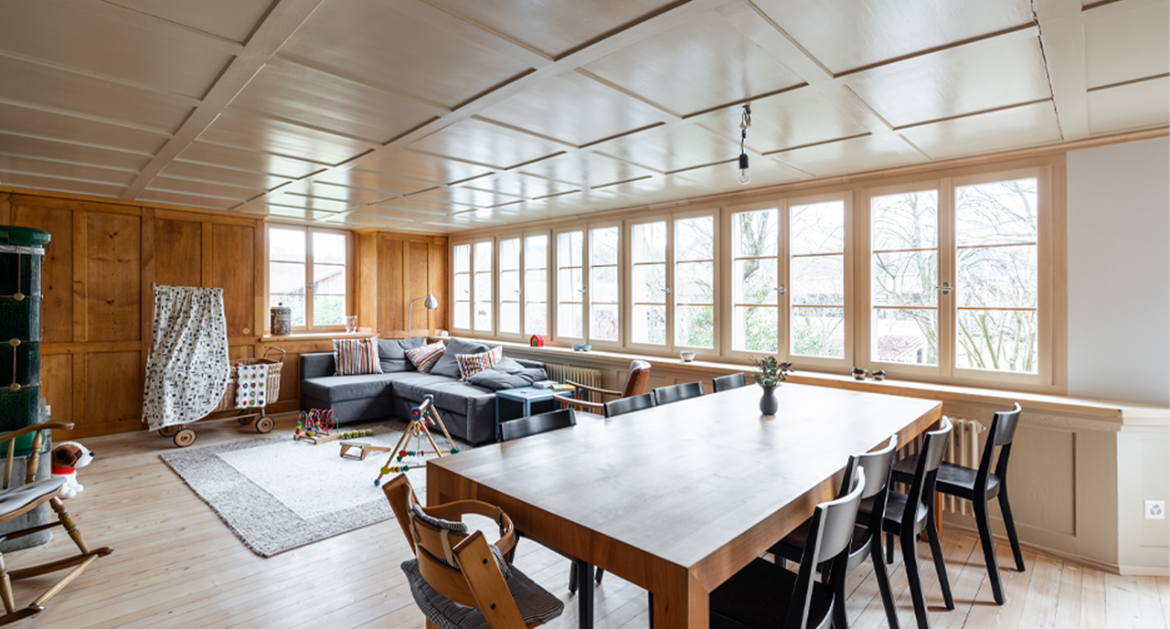 Das Wohnhaus beinhaltet eine 5.5-Zimmer Wohnung und eine 2-Zimmer Einliegerwohnung im Dachgeschoss. Im Erdgeschoss befindet sich das Wohnzimmer mit einem Kachelofen, die Küche und ein Zimmer mit direktem Ausgang in den Garten. Im Obergeschoss sind drei Schlafzimmer, ein Bad, ein Estrichabteil und zum Obstgarten gerichtet eine witterungsgeschützte Laube angeordnet.