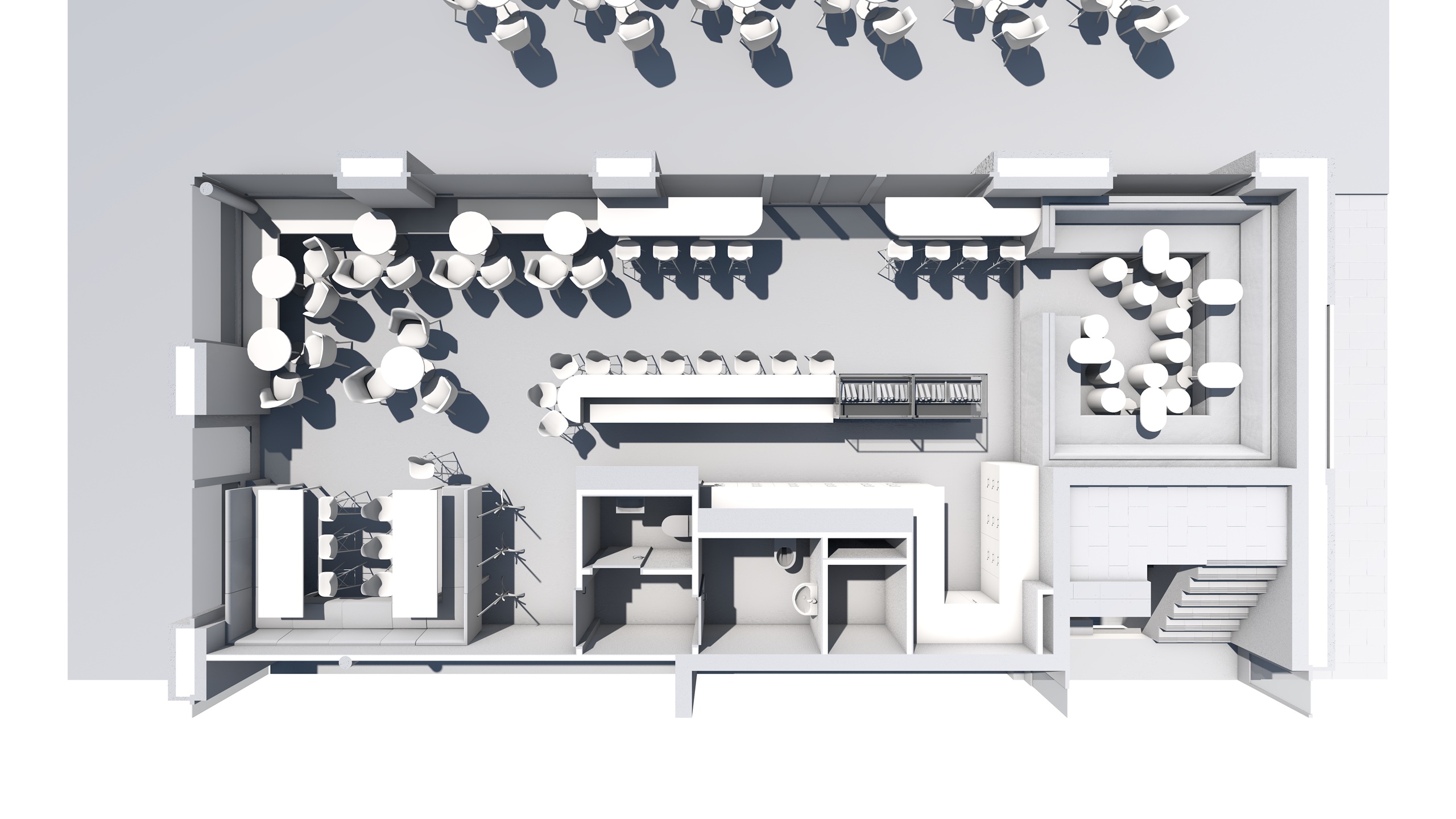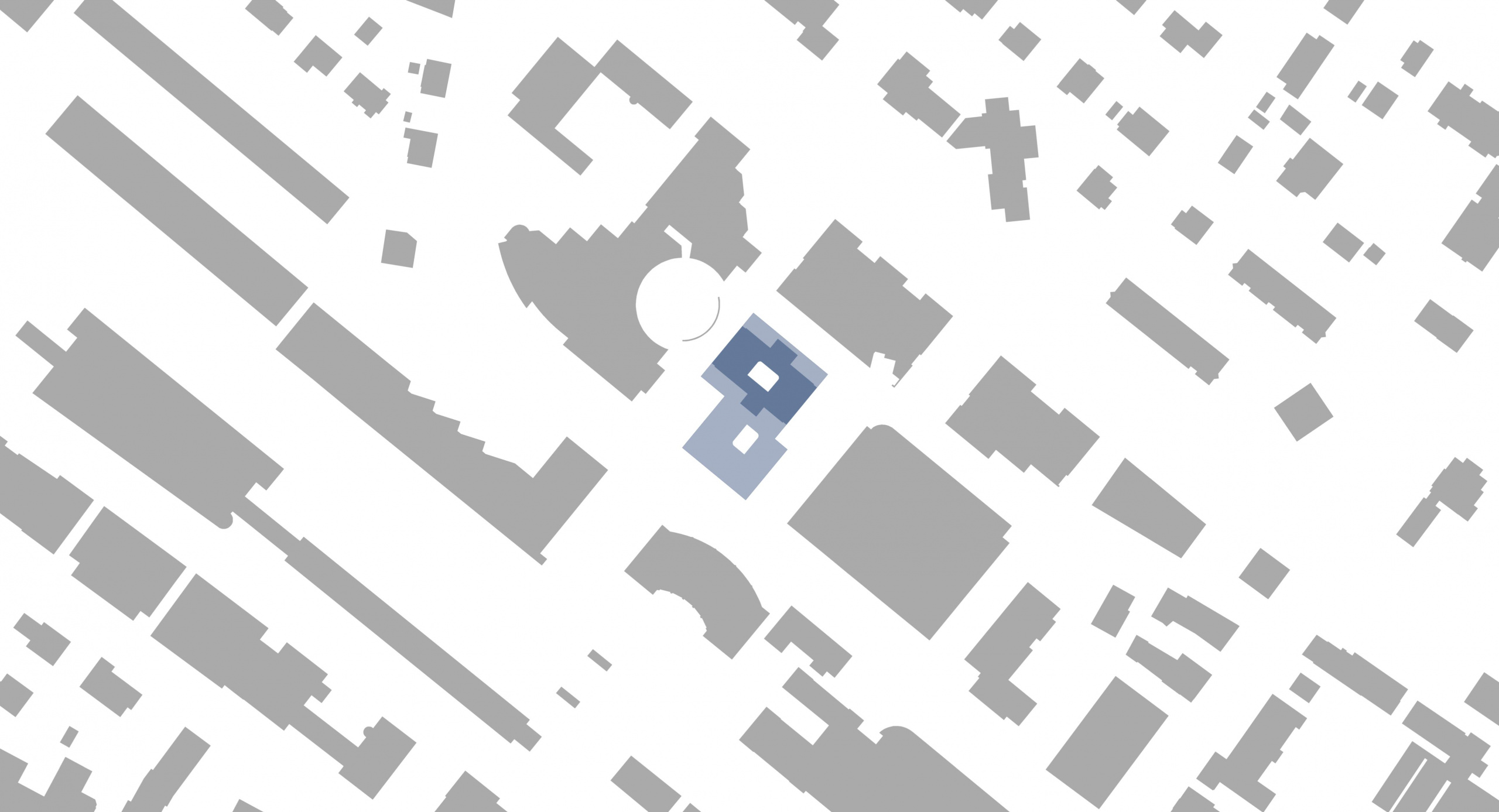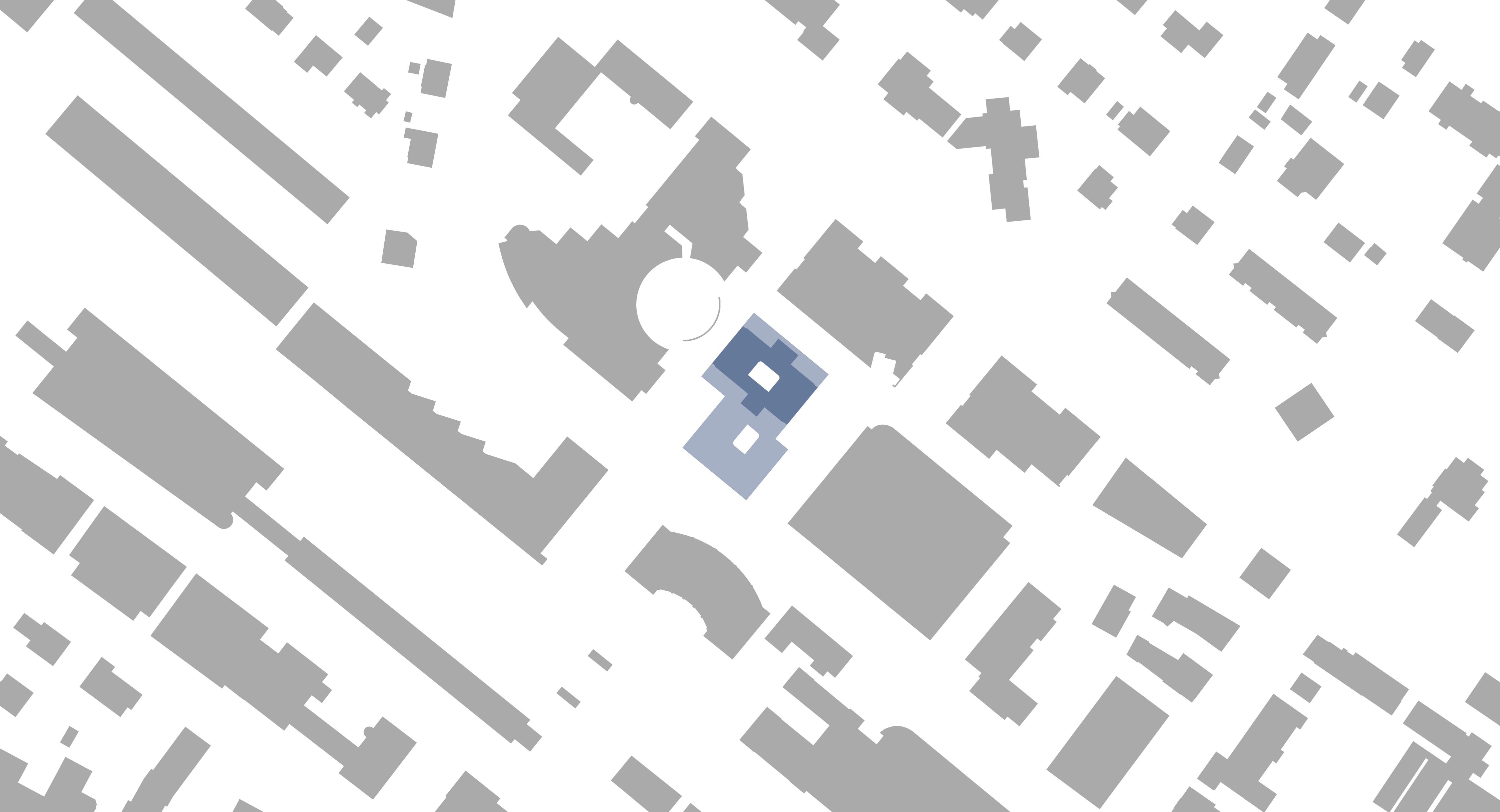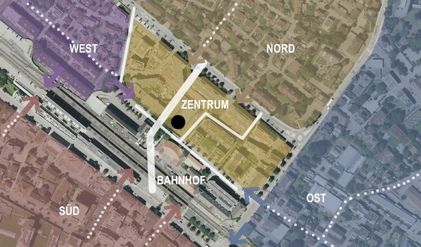 Das bestehende Atrium erhält ein Gegenüber und wird räumlich mit den akzentuiert gesetzten Loggias, welche auf die Rotunde präzis reagieren, gestärkt. Die Wegverbindung zum Bahnhof erfährt eine bewusste Aufwertung mit der Erstellung eines öffentlich zugänglichen chaussierten Hauptplatzes, welcher als Klimapuffer dient und mit Baumgruppen bespielt ist.
