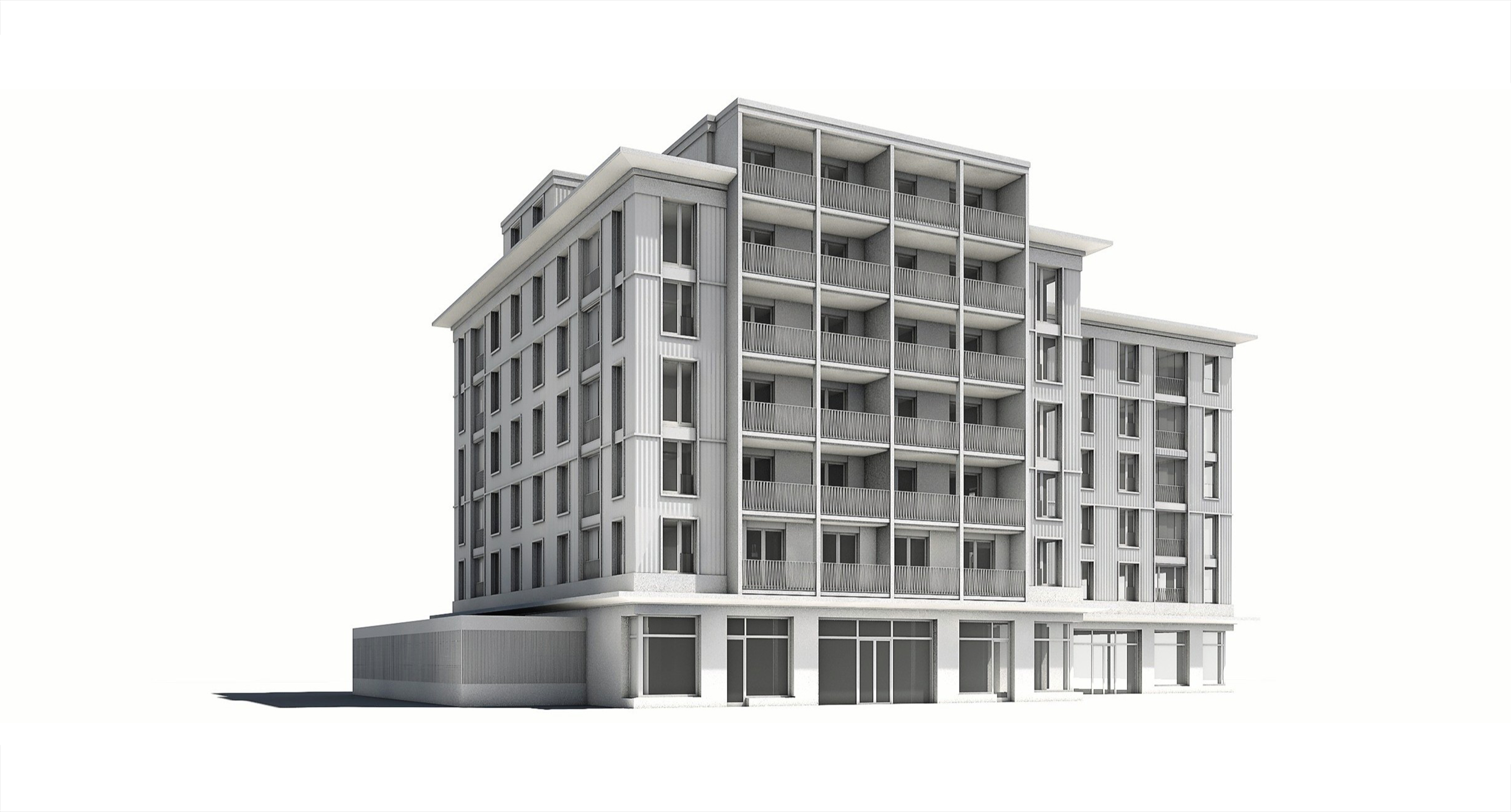 An zentralster Lage unmittelbar »hinter« dem Bahnhof, Gemäss ISOS “jenseits der Gleise” und in direkter Nachbarschaft des kantonalen Schutzobjekts »Lokremise«, entsteht das neue Wohn- und Geschäftshaus i6 mit 42 Mietwohnungen und 1550m2 Gewerbefläche.