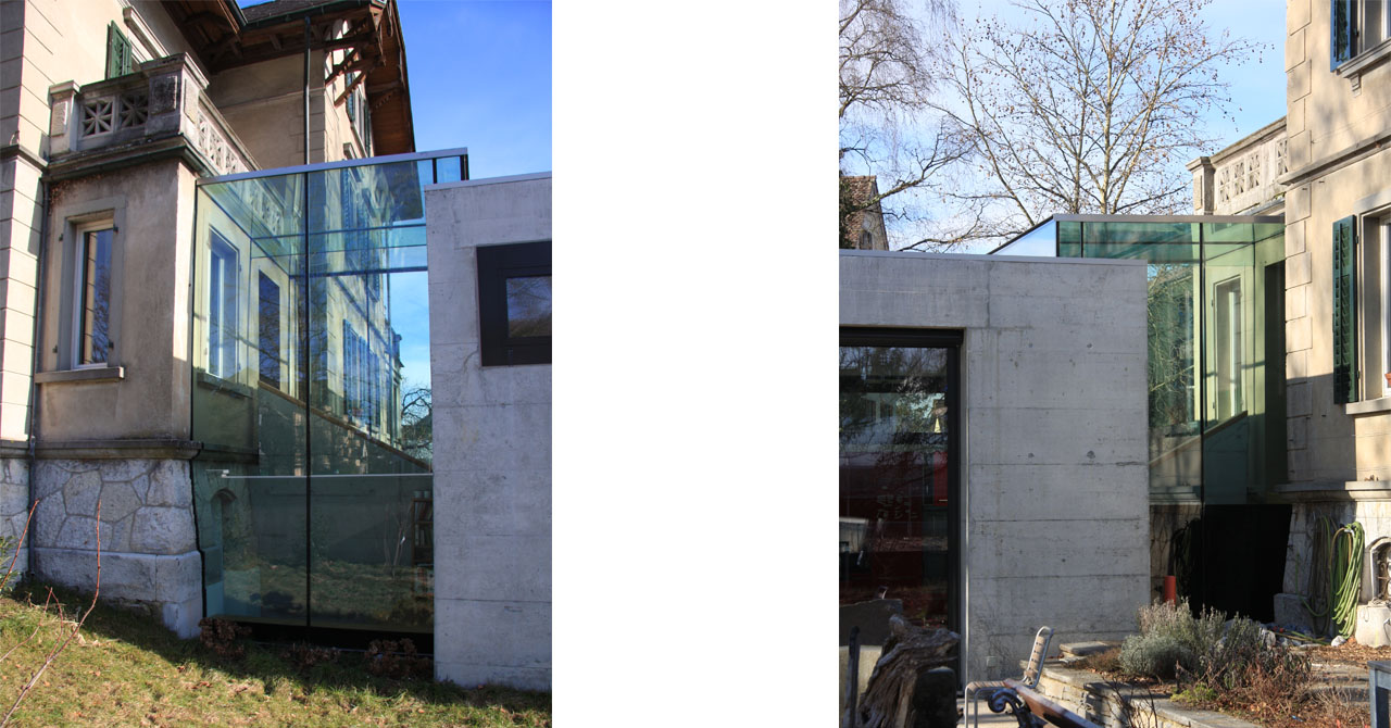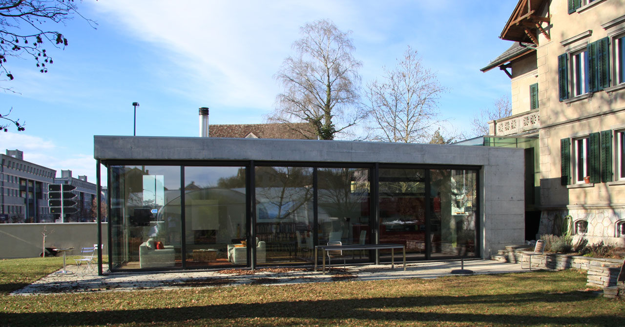 Im langgezogenen Parkgrundstück entlang der Brunnenstrasse steht zentral die 1896 für den Arzt Ritter erstellte Villa mit einen dazugehörigen Oekonomiegebäude. Die Villa ist über einem Kreuzgrundriss mit Zentralerschliessung aufgebaut. Durch einen ebenerdigen Pavillionbau (72m2) steht den Hochparterrebewohnern nun ein direkter Zugang zum geschützten Park zur Verfügung. Das Ziel, das bestehende Inventarobjekt zu bewahren und die Verbindung zwischen Alt und Neu unauffällig und transparent zu gestalten, wurde mittels konstruktivem Glasbau (Glas-Glas-Verbindungen) gelösst.